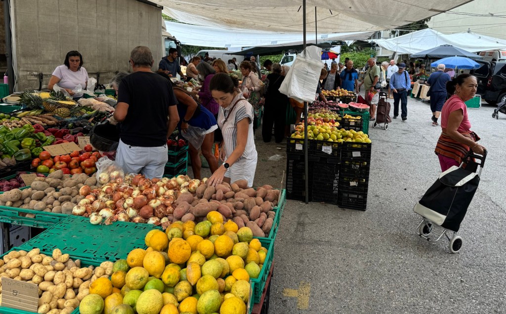 Every Thursday morning, the vibrant open-air market attracts locals and visitors alike to explore its diverse offerings. Today, Matthew and I eagerly ventured to the market, brimming with anticipation. On one side of the street, a delightful array of farmer’s market produce greeted us: luscious fruits and vegetables, aromatic herbs, farm-fresh eggs, golden honey, artisanal bread, a variety of cheeses, and flavorful cured meats. On the opposite side, a bustling market showcased a wealth of goods, from trendy apparel and soft linens to sturdy suitcases, stylish footwear, chic handbags, and charming dinnerware. Witnessing everyone navigate the market, laden with their bags or carts, added to the lively atmosphere. Cash transactions abound, infusing the market with a sense of tradition and community.